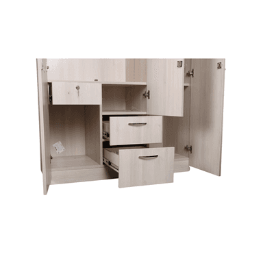 The Aasaro 3-Door Wardrobe has a minimal, clean design with an oak finish. At the centre, two easily accessible drawers offer convenient storage, while a full-length mirror above them adds functionality and style. Inside, a lockable drawer provides secure storage for valuables.