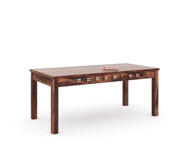 The Adiva Sheesham 6-seater Dining Table, featuring a sleek design and cu-out pattern, offers durability and style with its veneer table top. Perfect for family gatherings, it's easy to maintain and serves as an elegant addition to your dining area.