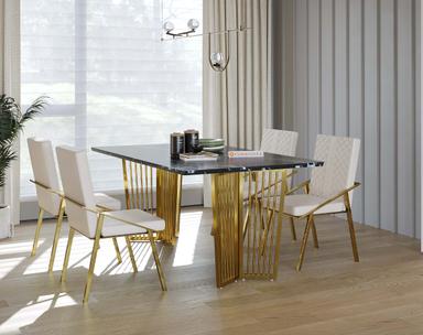 The 4-seater Barolo Dining Table with Black Engineered Marble Top combines modern design with robust functionality. The black engineered marble, crafted with seven layers of coatings for superior durability and aesthetics, rests gracefully on a sturdy SS304 stainless steel frame coated with premium PVD. This table exemplifies quality craftsmanship and durability, perfect for elevating any contemporary space.