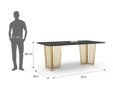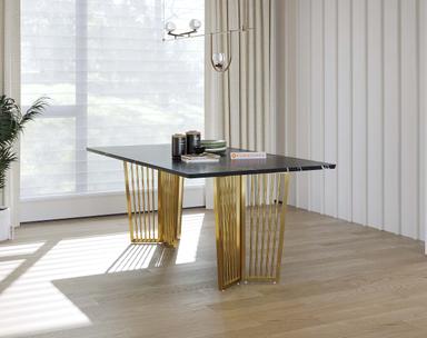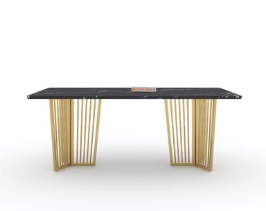 Featuring a sturdy PVD-coated stainless steel frame, the Barolo Dining Table offers one of the highest scratch resistance and rust-proof properties. The black engineered marble top is treated with a chemical coat (Epoxy) to enhance its shine and protect against everyday wear and tear.