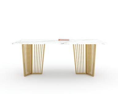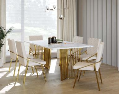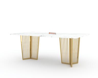 The 6-seater Barolo Dining Table with White Engineered Marble Top combines modern design with robust functionality. The white engineered marble, crafted with seven layers of coatings for superior durability and aesthetics, rests gracefully on a sturdy SS304 stainless steel frame coated with premium PVD. This table exemplifies quality craftsmanship and durability, perfect for elevating any contemporary space.