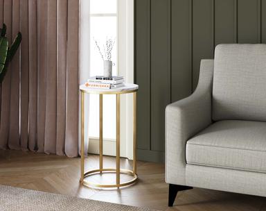 The Windsor round side table is a golden accent for your space, perfect for keeping a lamp or a drink nearby. Its marble top adds a touch of timeless luxury to any room.
