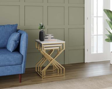 The Melbourne Marble Nesting Tables in Gold Finish offer a geometric dance of elegance and convenience. These three interlocking tables provide a dynamic solution for entertaining and living with a flair of sophistication.
