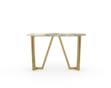 Featuring a robust PVD-coated stainless steel frame, the Olzaa Console Table offers superior scratch resistance and rust-proof qualities. The Green Choco marble top is treated with a chemical coat (Epoxy) that enhances its shine and provides resistance against hot liquids.