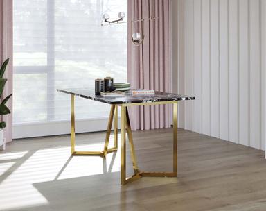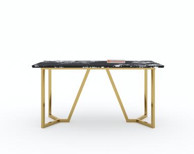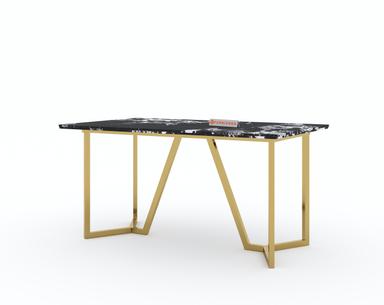 Featuring a sturdy PVD-coated stainless steel frame, the Olzaa Dining Table offers one of the highest scratch resistance and rust-proof properties. The black engineered marble top is treated with a chemical coat (Epoxy) to enhance its shine and protect against everyday wear and tear.