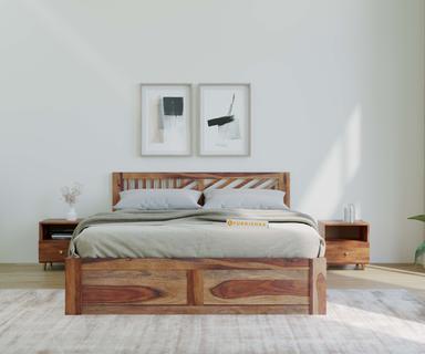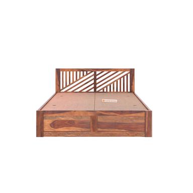 - Design : Sheesham headboard with unique line play, includes box storage.
