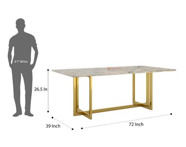 The 6-Rodano Dining Table features a robust PVD-coated stainless steel frame that offers exceptional scratch resistance and rust-proof properties. It easily lasts for 10 years with regular usage. The Australian Onyx marble top is treated with a chemical coat (Epoxy) for added shine and protection against hot liquids.