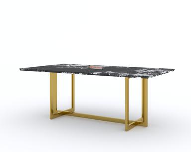 The 6-seater Rodano Dining Table with Etna Black Marble Top combines elegance and robust functionality. The real Italian Etna Black Marble, known for its exquisite color variations and premium quality, sits atop a sturdy PVD-coated stainless steel frame with sleek legs. This table is a sophisticated addition to any dining space, offering both aesthetic appeal and durability.
