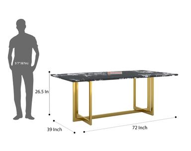 Featuring a sturdy PVD-coated stainless steel frame, the Rodano Dining Table offers exceptional scratch resistance and rust-proof properties. It easily lasts for 10 years with regular usage. The black engineered marble top is treated with a chemical coat (Epoxy) to enhance its shine and protect against everyday wear and tear.