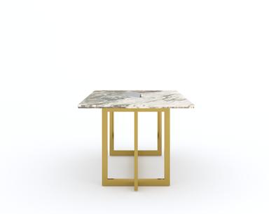 Featuring a robust PVD-coated stainless steel frame, the Rodano Dining Table offers superior scratch resistance and rust-proof qualities. The Green Choco marble top is treated with a chemical coat (Epoxy) that enhances its shine and provides resistance against hot liquids.