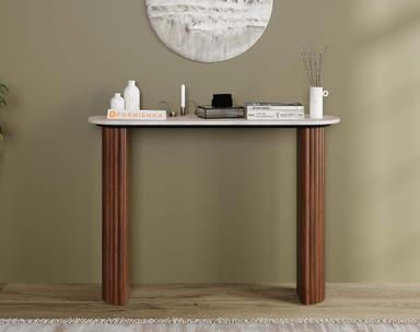 This console table combines travertine and mango wood, offering durability and timeless appeal. Travertine, known for its resistance to scratches and stains, adds elegance with its natural variations. Mango wood provides strength and a unique grain pattern. Together, they create a stylish and sturdy dining table suitable for everyday use and gatherings.