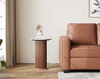 - Material : Italian marble top on fluted mango wood base with a warm walnut finish.